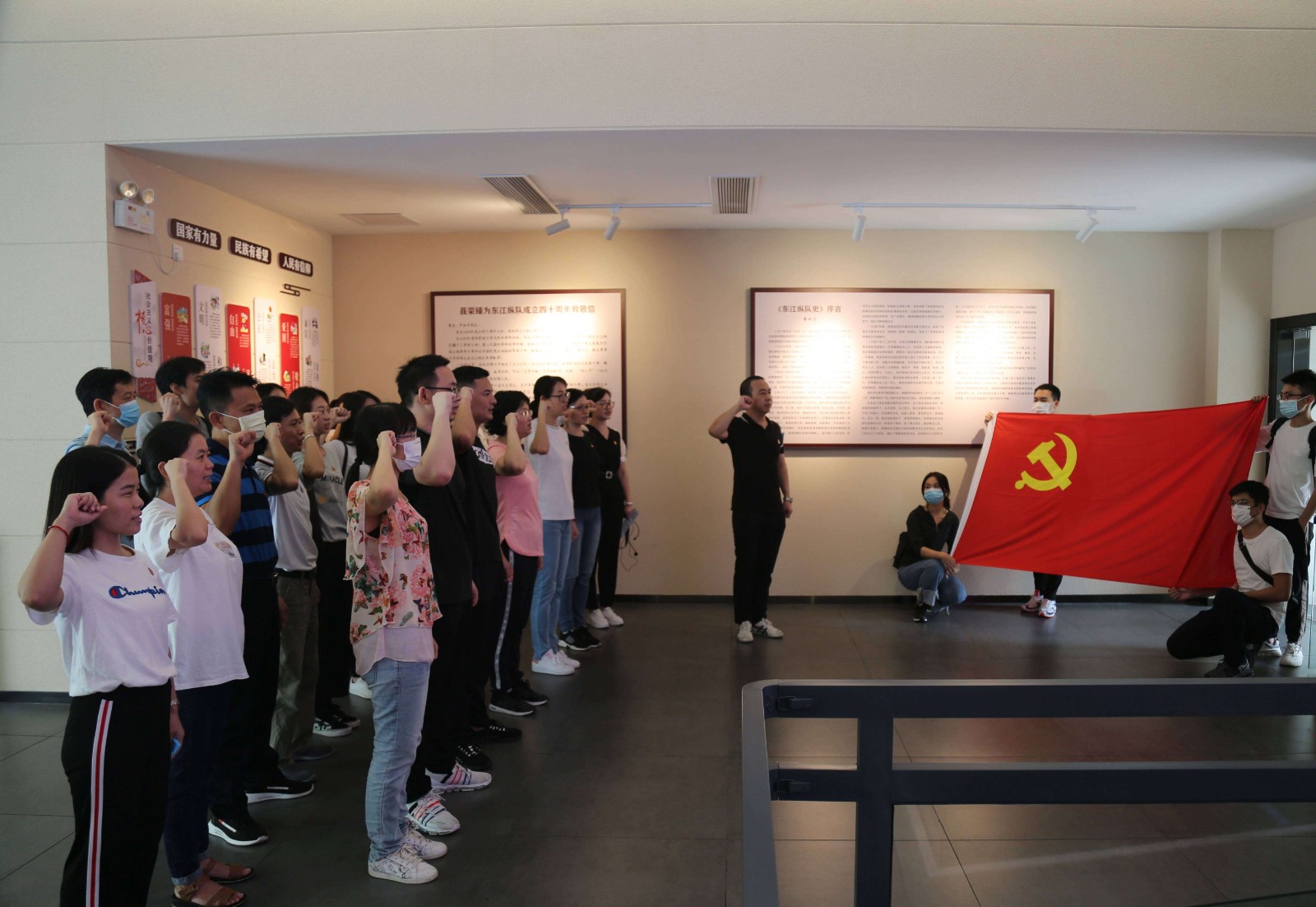 在东江纵队纪念馆大堂,全体党员佩戴党徽,列队齐整,面对鲜红的党旗,庄严地举起右手,重温入党誓词。紧握的拳头,慷慨铿锵的誓词,使全体党员热血沸腾,大家纷纷表示,要不忘初心、牢记使命,自觉对标党章要求,在企业岗位中将党员模范作用发挥出来;对标岗位职责,把责任扛起来。做一名有责任、有理想、有本领、有担当的新时代共产党员,勇于攻坚克难和改革创新,不断努力奋斗为企业发展贡献一己之力。